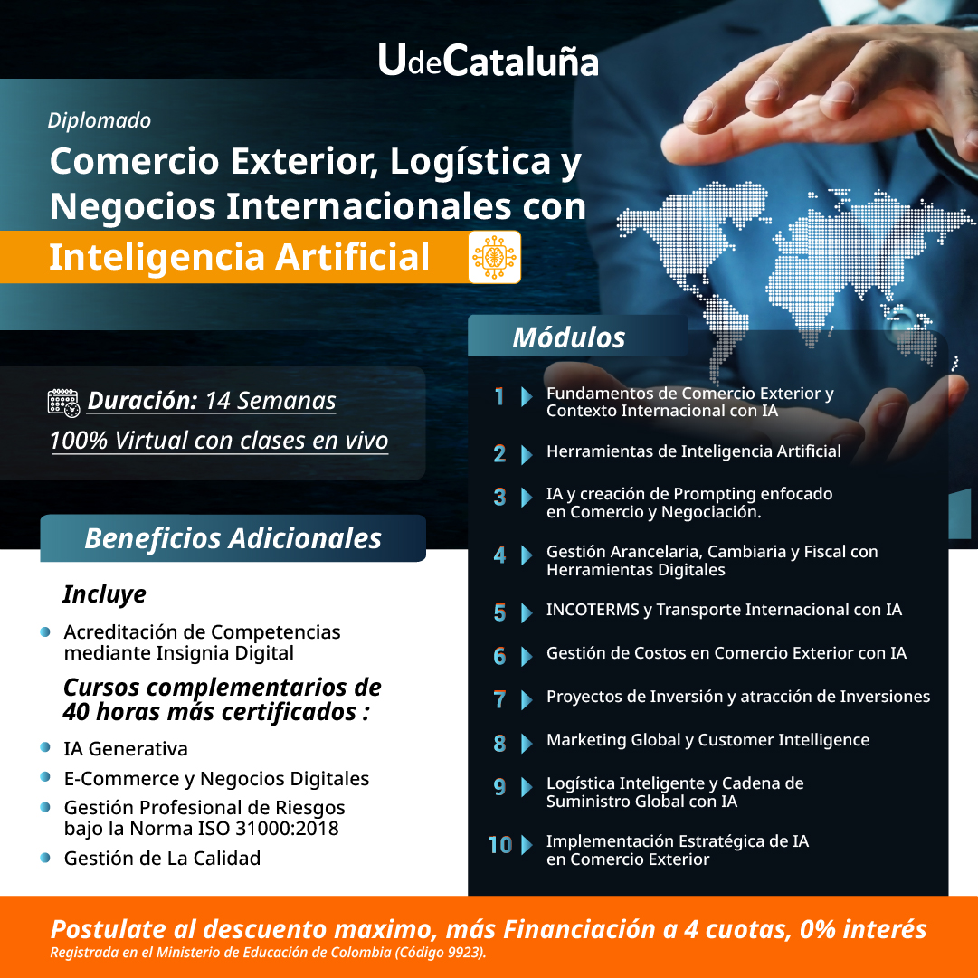 En este contexto, UdeCataluña se posiciona como un aliado estratégico. Nuestro Diplomado en Comercio Exterior y Negocios Internacionales con Inteligencia Artificial combina teoría con casos reales, ofreciendo a los estudiantes: