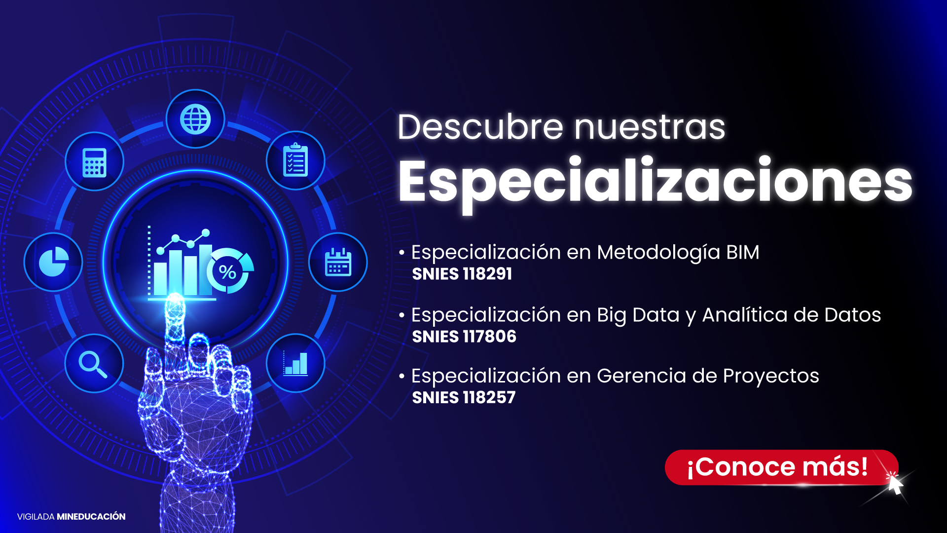 • * Especializaciones en Big Data y Analítica de Datos, Metodología BIM y Gerencia de Proyectos